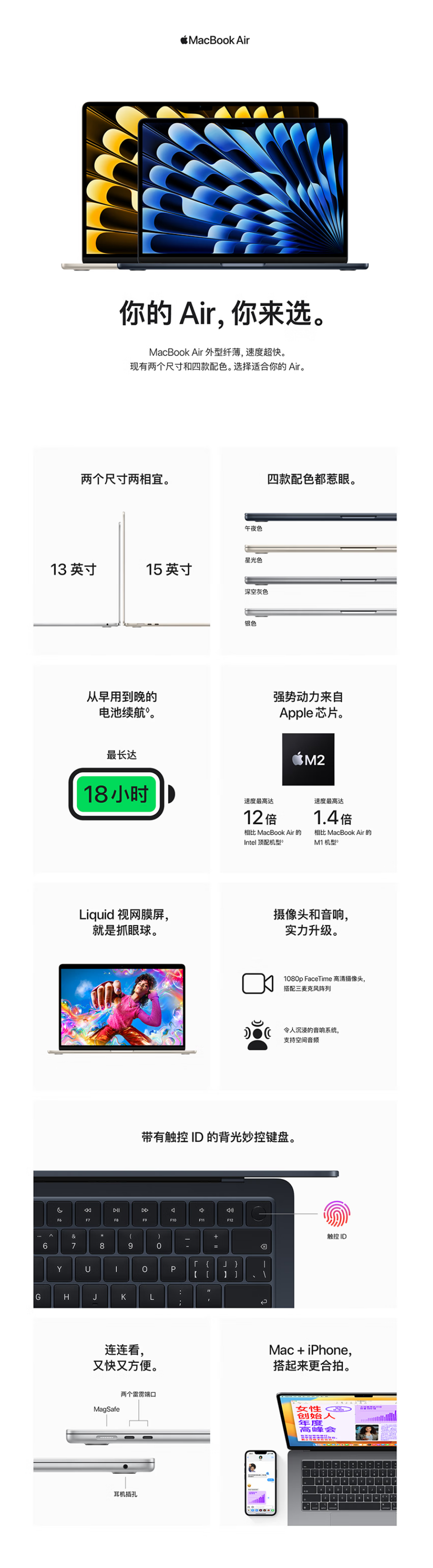Apple MacBook Air笔记本电脑午夜色M2芯片(8核中央处理器、10核图形处理器和16核神经网络引擎)24GB/2TB固态硬盘/15.3英寸/1080p/触控ID的背光妙控键盘-中文(拼音)1年