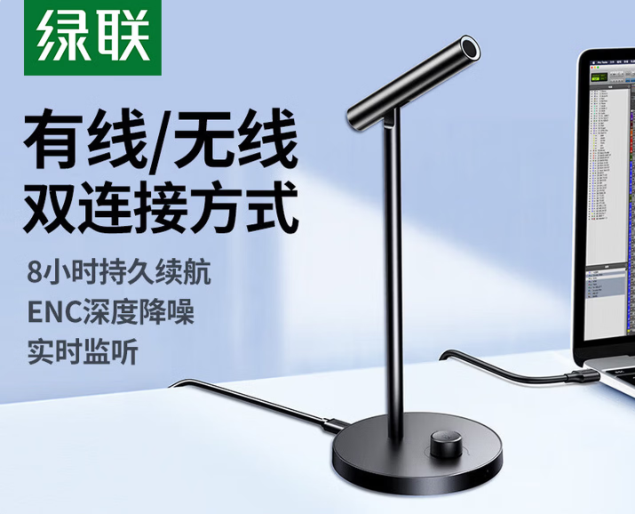 绿联USB电脑桌面麦克风电容麦话筒 无线款DSP智能降噪台式机笔记本K歌直播网课语音会议适用音箱35344